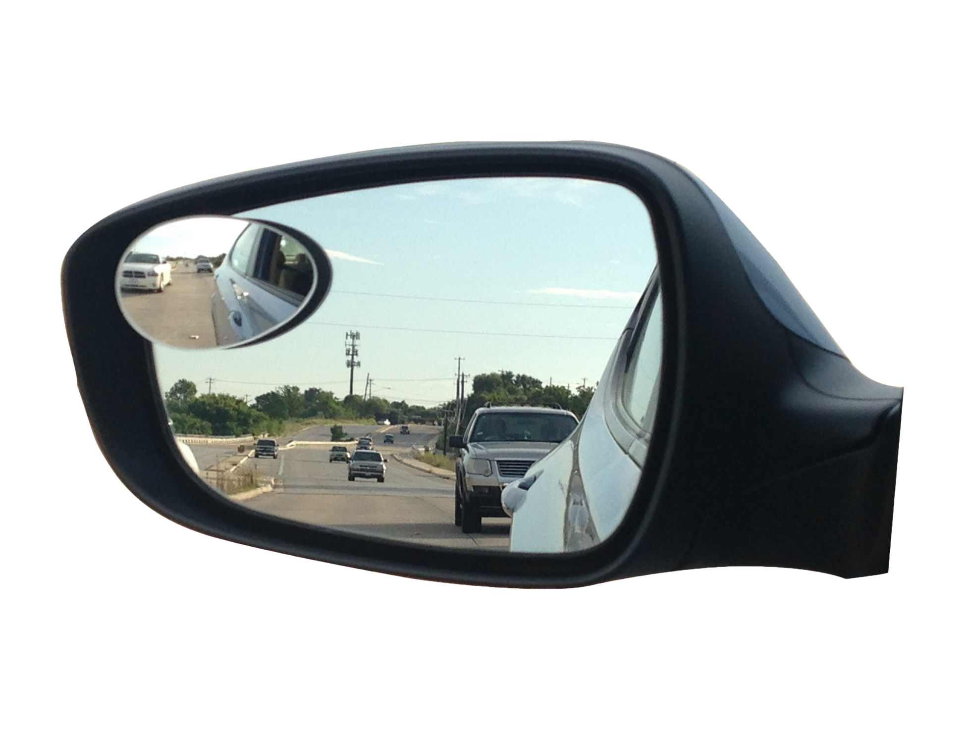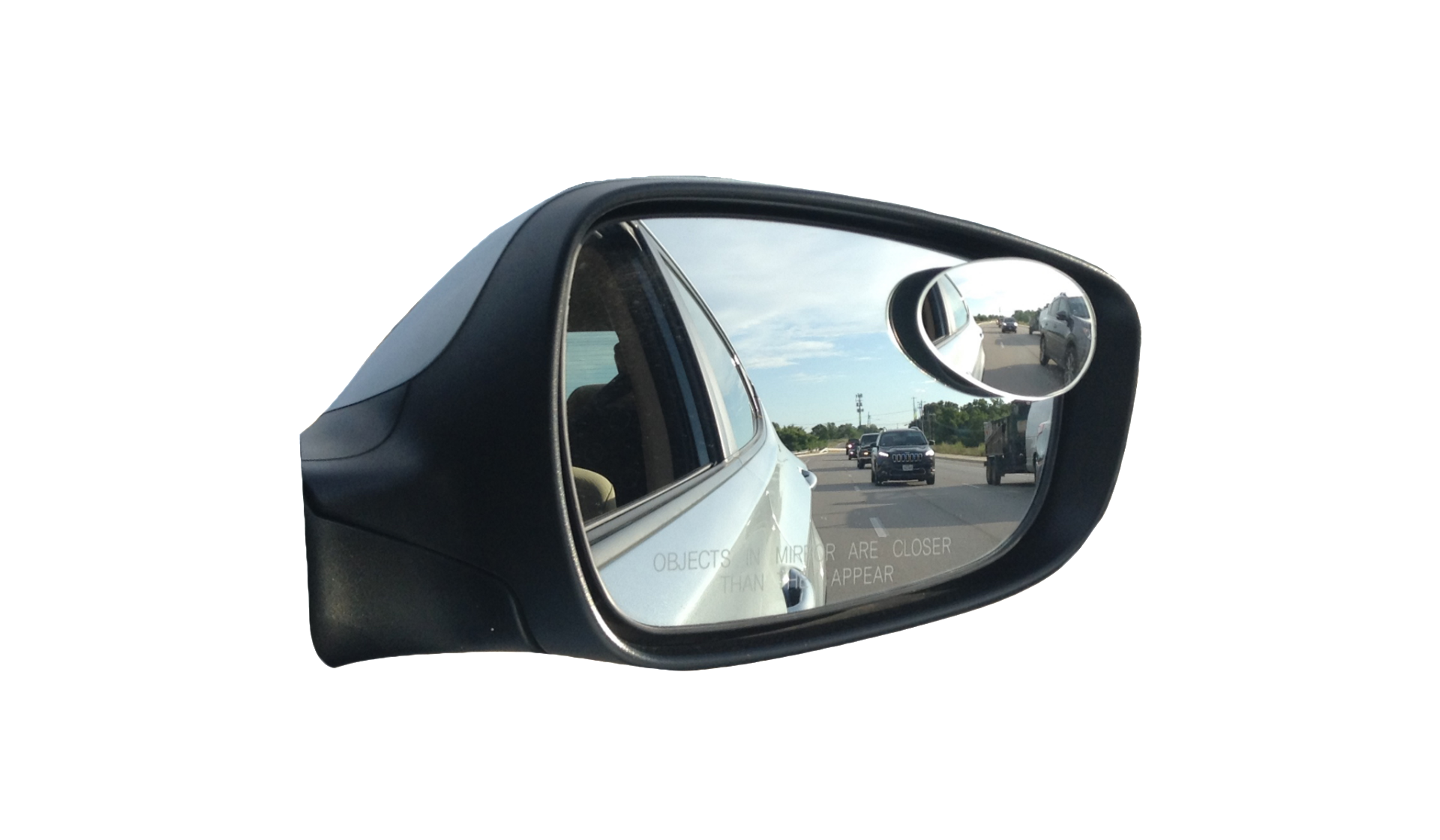 An adjustable rearview blind-spot mirror. With a less convex design, this mirror offers a larger image of what’s on the side and rear of a car.